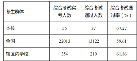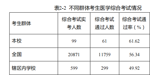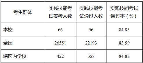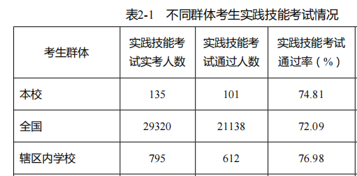 临床医学专业学生技能通过率为74.81%,超全国实践技能考试通过率2.72个百分点。综合通过率为61.62%,超全国综合考试通过率5.28个百分点。